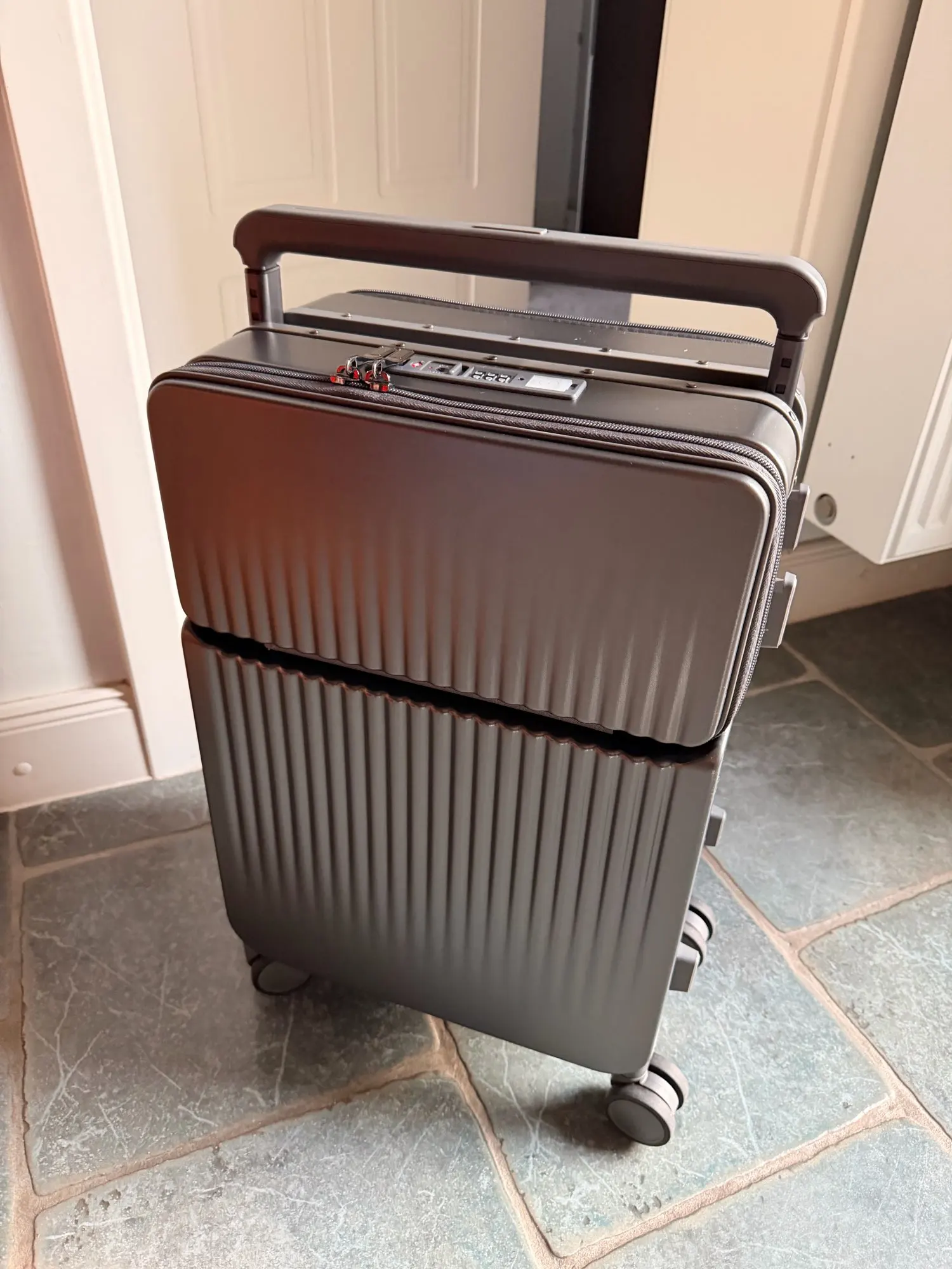 La valise dispose de deux serrures homologuées indépendantes. L'une sécurise le compartiment frontal (PC et documents), l'autre sécurise l'accès principal. Vous accédez à vos outils de travail sans jamais exposer vos vêtements et effets personnels.